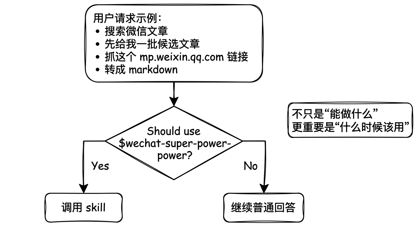 写 skill 时,不要只写“我能做什么”,更要写“什么时候该找我”。