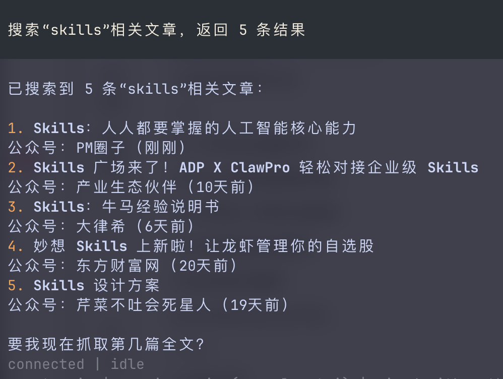趁着这两天休息花一点时间深入研究了 ClawHub 上 WeChat 相关 skills 的实现方式,又自己从零做了一套“微信公众号搜索 + 文章抓取转 Markdown”的 skill。