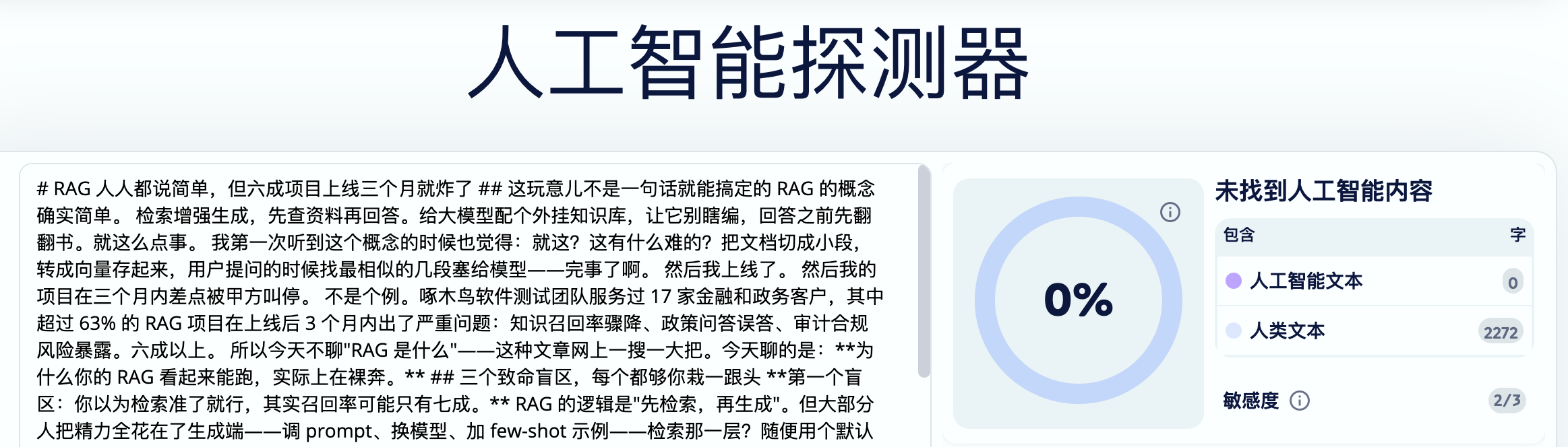 检测下 AI 浓度,把上面生成的文章拿去跑了下,居然全部为“人能文本”。