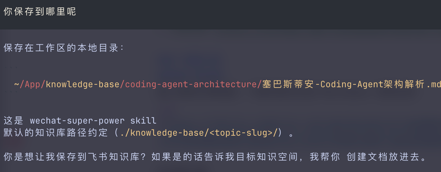 目前是保存到本地目录,如果你想上传到飞书文档,只需要安装飞书相关的 Skills 就可以直接上传。