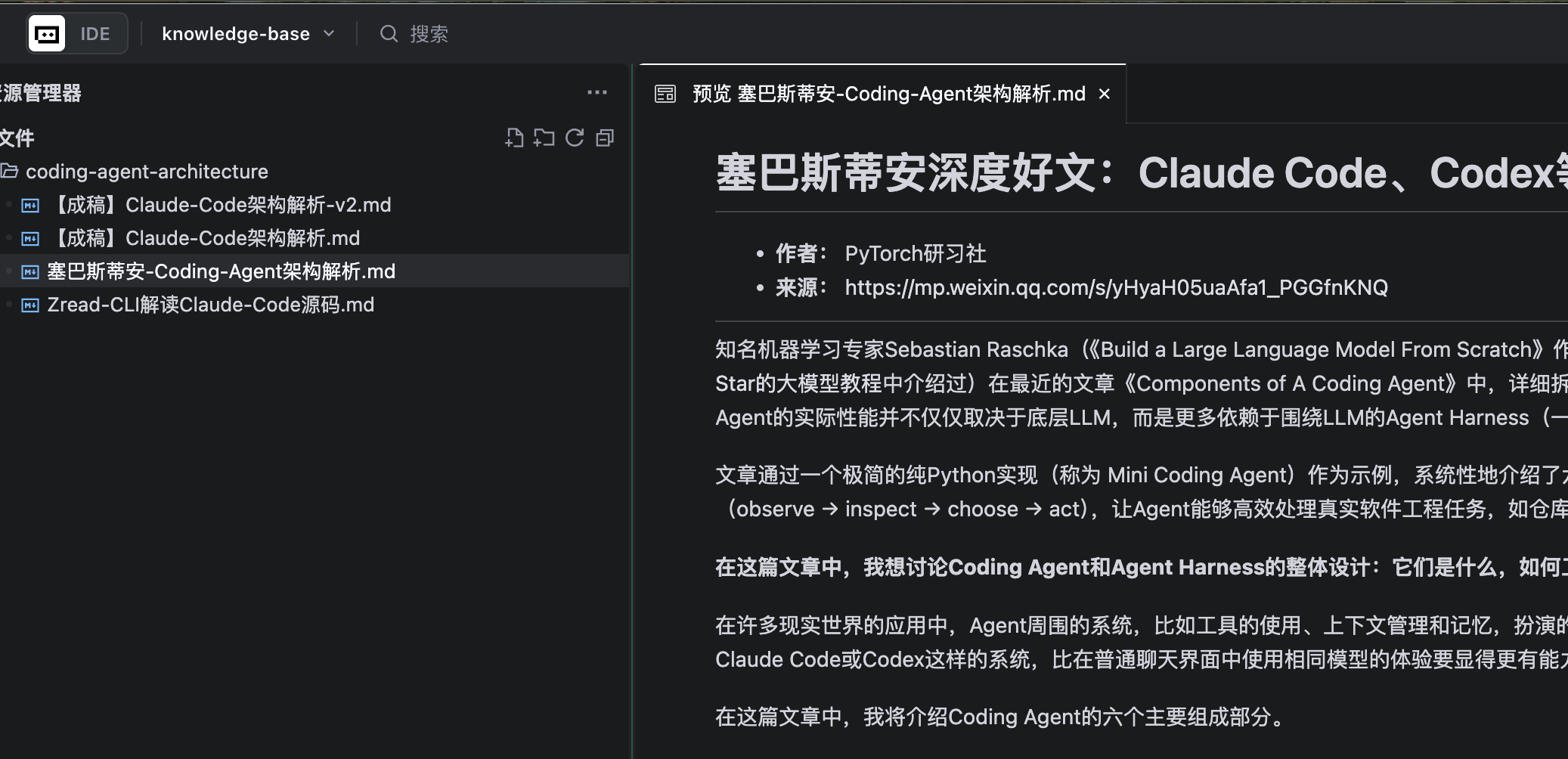知识库没有使用 RAG ,使用的是 Markdown 文档方便阅读,后续也可以考虑 chunk embeding 下!