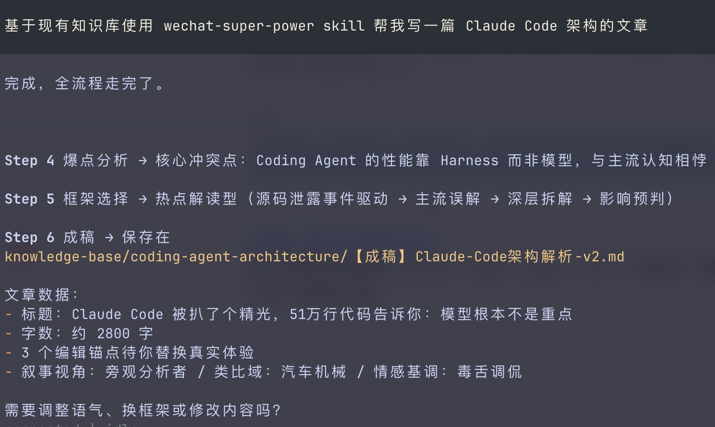 基于现有知识库使用 wechat-super-power skill 帮我写一篇 Claude Code 架构的文章。
